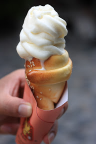一進老街區,就有停車場,老街也禁止車輛進出,有用心規劃過,大部份的商店都是賣陶藝品、水晶,少數賣吃的,街道寬敞,如果習歡購買陶瓷藝品、或陶瓷器皿的,這裡是不錯的選擇,在這有一家賣"牛角冰琪琳" 的店,因沒吃過,和張小豪各買了一支,冰琪琳味道偏甜、牛角麵包也還好,但太乾了,售價也不友善(65元),