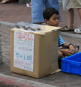 想嘗鮮的人要考慮一下,吃完覺得很口渴。因為熱,所以跑去吃豆花,黑豆豆花喔,其實吃起來和一般的一樣,不過蠻嫩的,算不錯吃。要離開老街時,發現一個很有趣的攤位,一個小朋友在賣很大隻的獨角仙,有趣的是他的海報寫"小朋友自行培育,他就是--變形金剛",